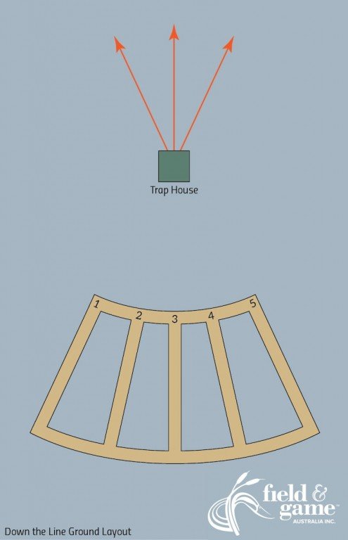 Down the Line has five shooting stands arranged in an arc, with the trap house located in front of the shooting stands. Targets are thrown from this central trap house, moving away from the shooting stands within a defined arc. Shooters move between the stands after each round of targets, rotating between the five set shooting points. Down the Line grounds and targets may differ slightly from place to place, but are essentially the same.