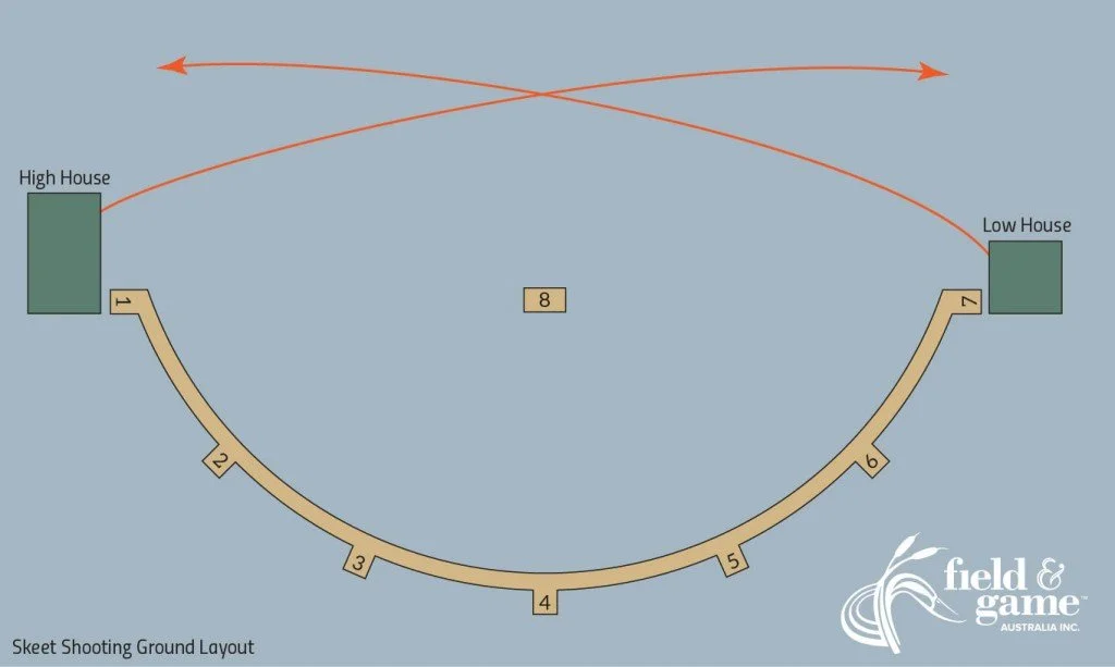 Skeet shooting is where targets are thrown from two separate towers, one high and one low, on set trajectories. Each target thrown from each tower will be the same, but the shooter changes position, moving around a semi-circular course with set shooting points. Skeet grounds, and skeet targets, will be very similar, if not identical, the world over.